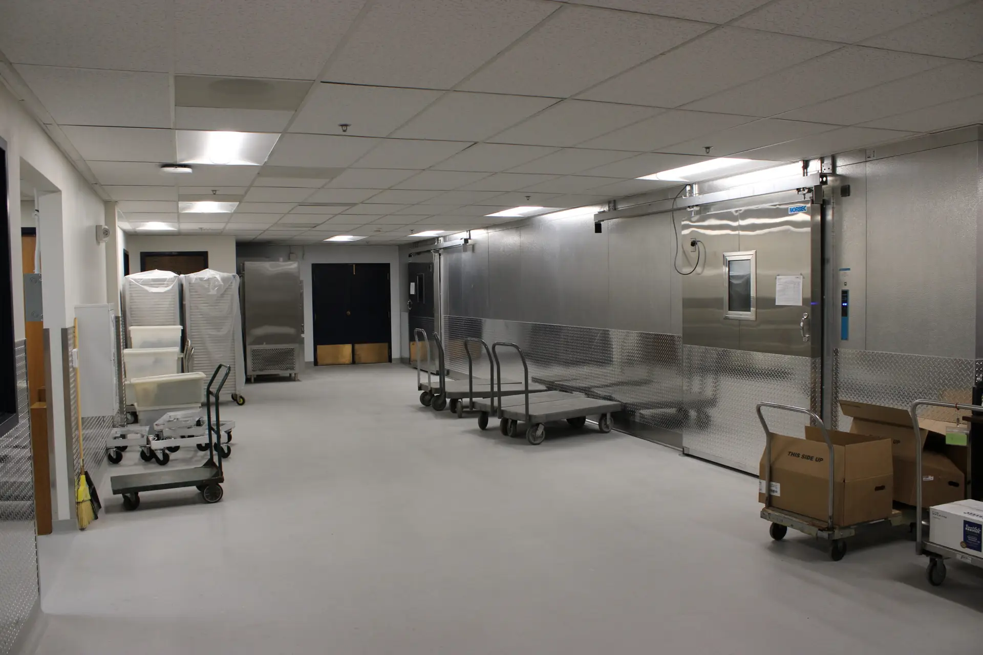 Phase 1 included renovating the office, receiving area, staff restrooms, and break space. It also involved upgrades to the mechanical and electrical systems and exterior concrete work for the lift replacement. Phase 2 required the complete demolition of existing coolers, freezers, exhaust hoods, and kitchen equipment, followed by a full renovation and installation of all new systems and equipment.