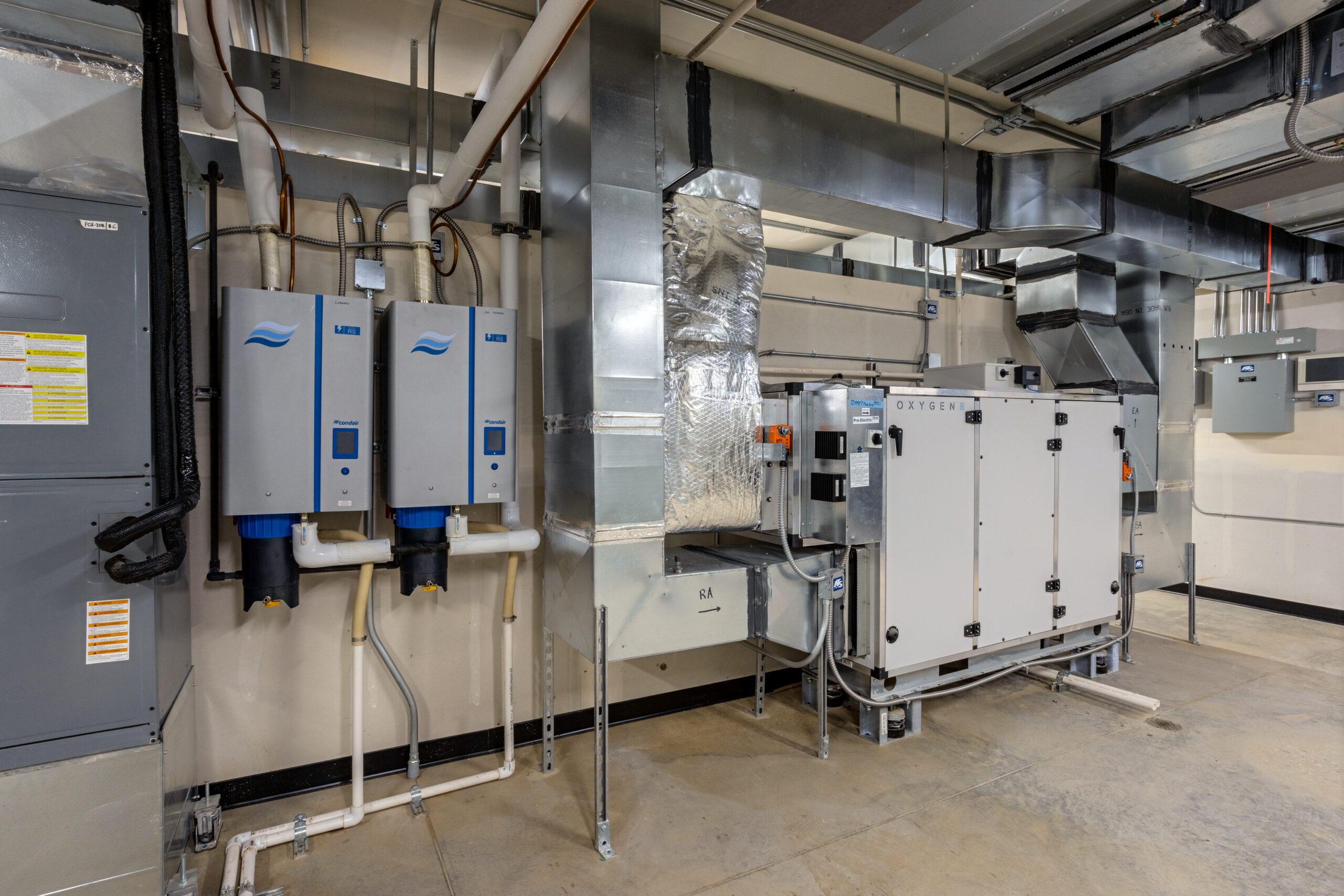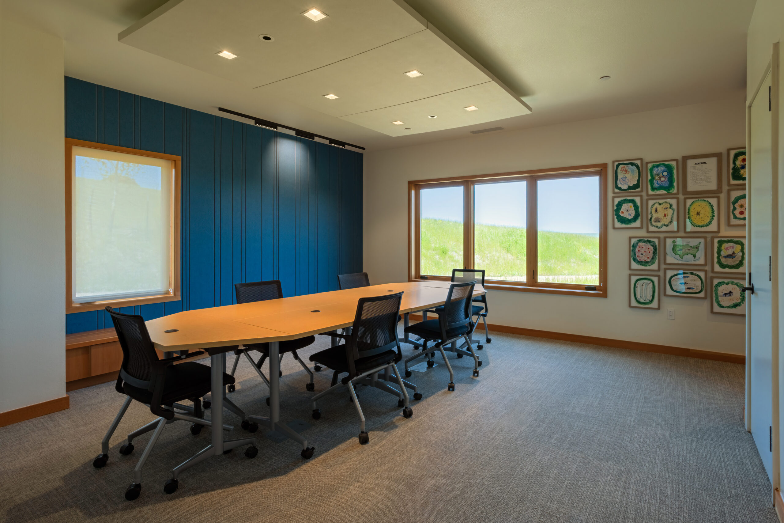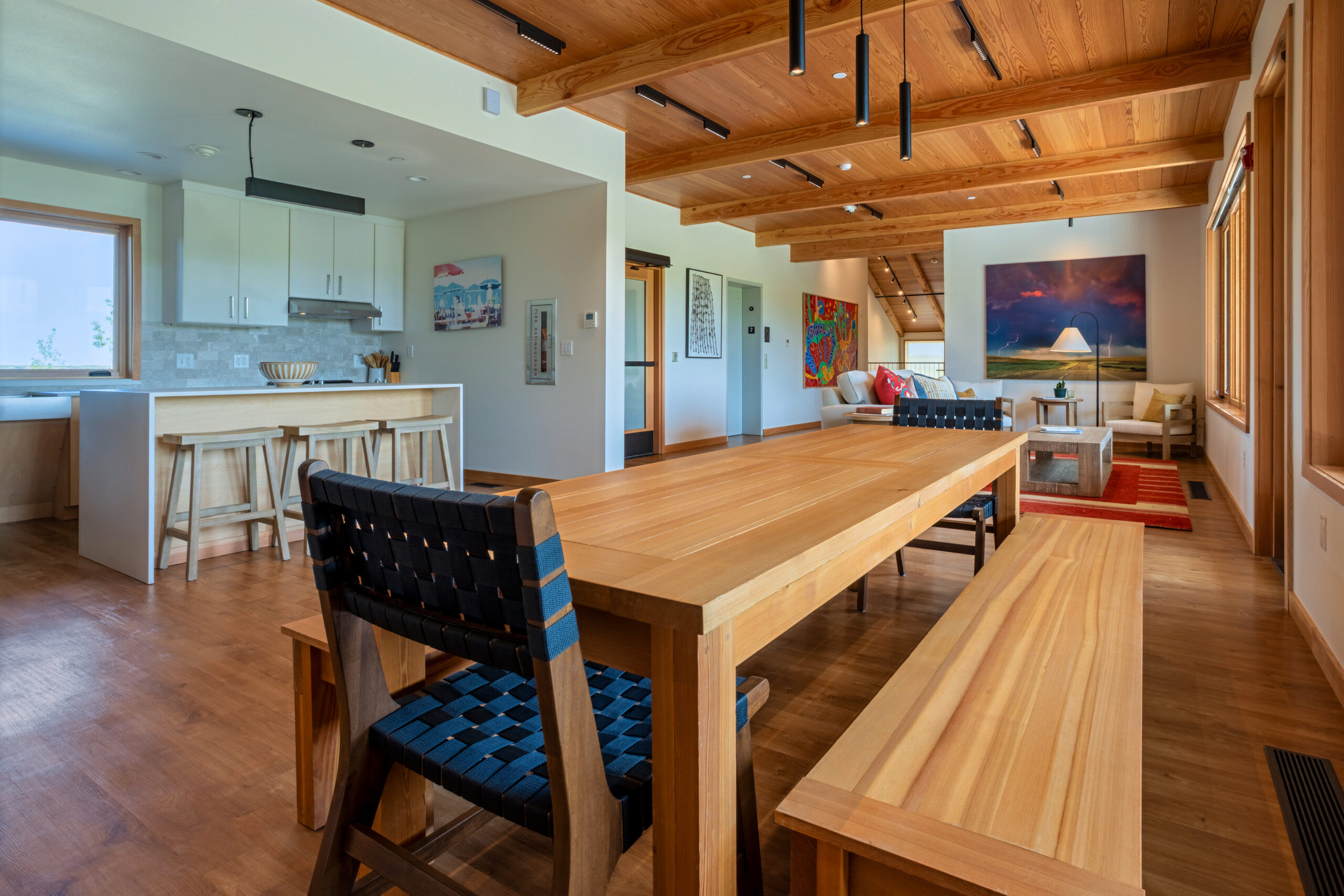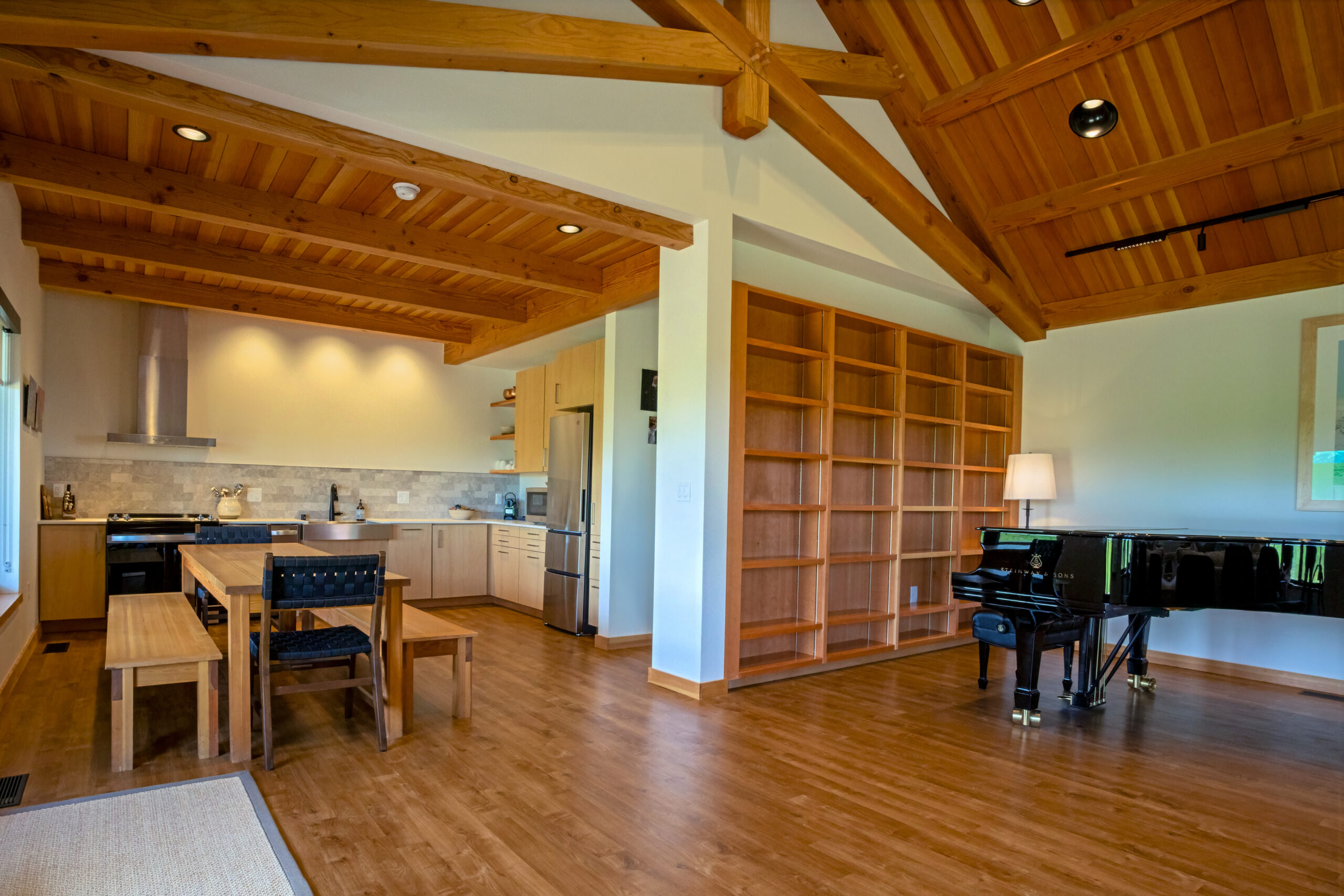 The other buildings constructed were the four Nimbus residences grouped in pairs to accommodate the artists on site, and a smaller separate practice facility. Site work on this project included pathways connecting the buildings on campus, new-geo thermal ground loops, potable and non-potable water systems, a sewer system and the construction of a free-standing solar system which is integrated into the existing campus power grid.